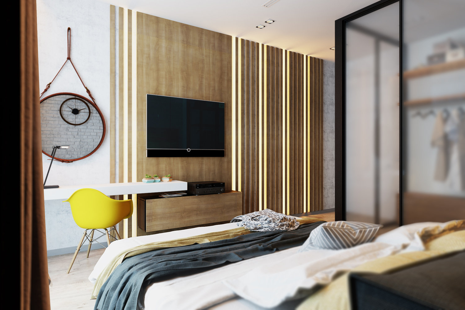 Спальня с белым кирпичом и яркими акцентамиГамма