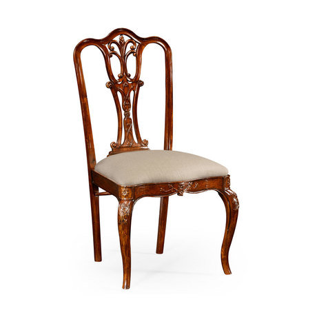 Стул выполнен в элегантном стиле позднего 18 века из красного дерева. Спинка стула исполнена в ажурной резьбе. Высота сиденья: 49,6 см