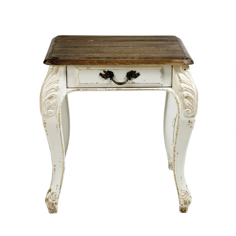 Кофейный столик в стиле прованс с изящными ножками, украшенными декоративной резьбой. Выдвижной ящик для хранения мелочей. Фурнитура выполнена из латуни. Массив дуба, топ выполнен из брашированного дуба.