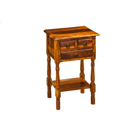 Прикроватный столик в индийском стиле привлекает своей простотой и естественным разноуровневым цветом натурального дерева. Три выдвижных ящичка ограничены металлическими ручками в виде колец и дополнены открытой полкой у основания.