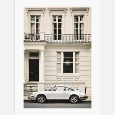 Фотография Porsche перед зданием. Мотив обрамлен встроенным белым паспарту.
